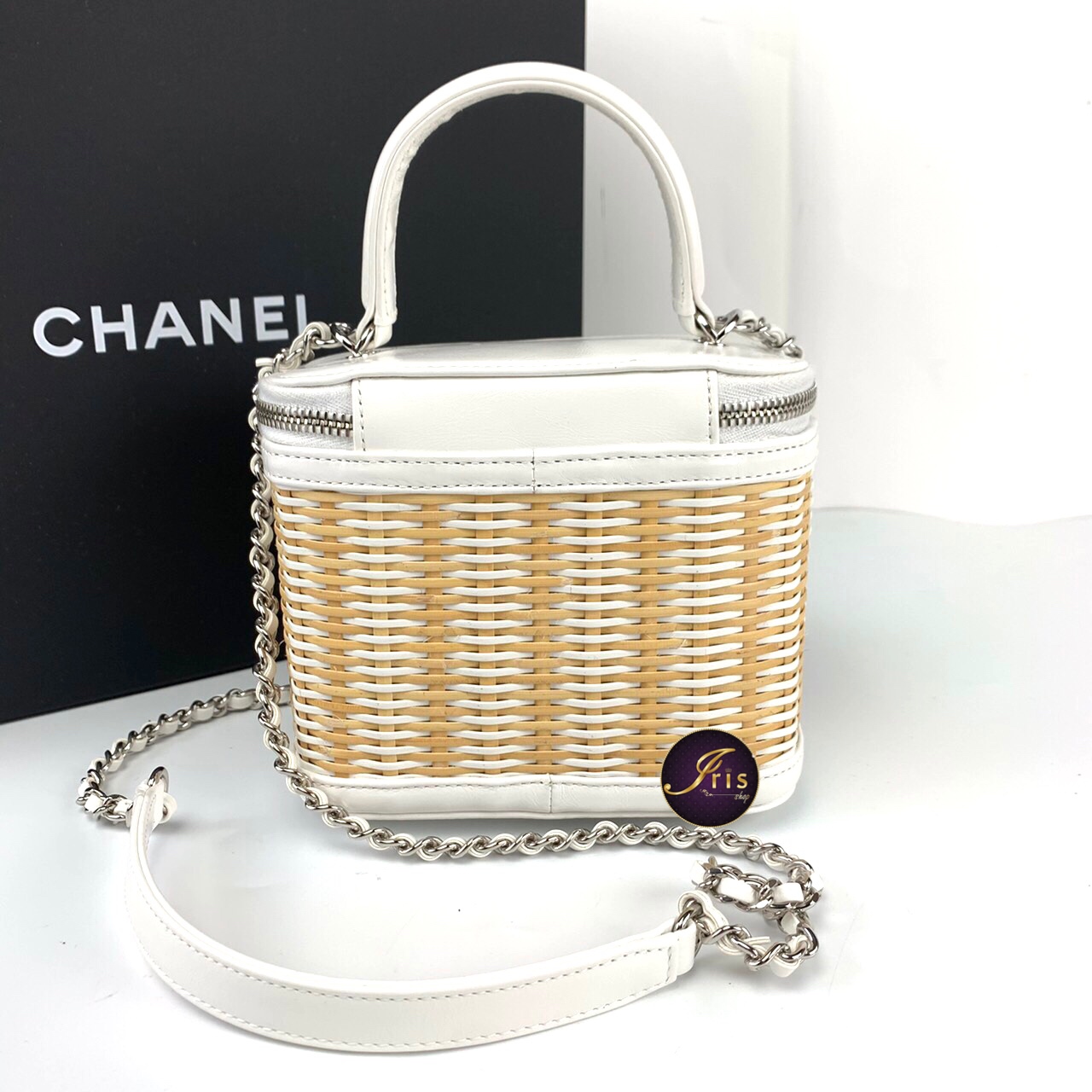 Chanel Rattan white Calfskin Small Vanity Case ของใหม่ พร้อมส่ง‼️กระเป๋าทรง vanity ความเก๋อยู่ที่เป็นกระเป๋าที่สานมาจากวัสดุธรรมชาติผสมผสานกับหนังวัวสีขาว อะไหล่สีเงินเงาสวยเก๋เข้ากับ summer, ทะเล มากๆ เลยค่ะ ขนาด 5.3′ x 5.9′…