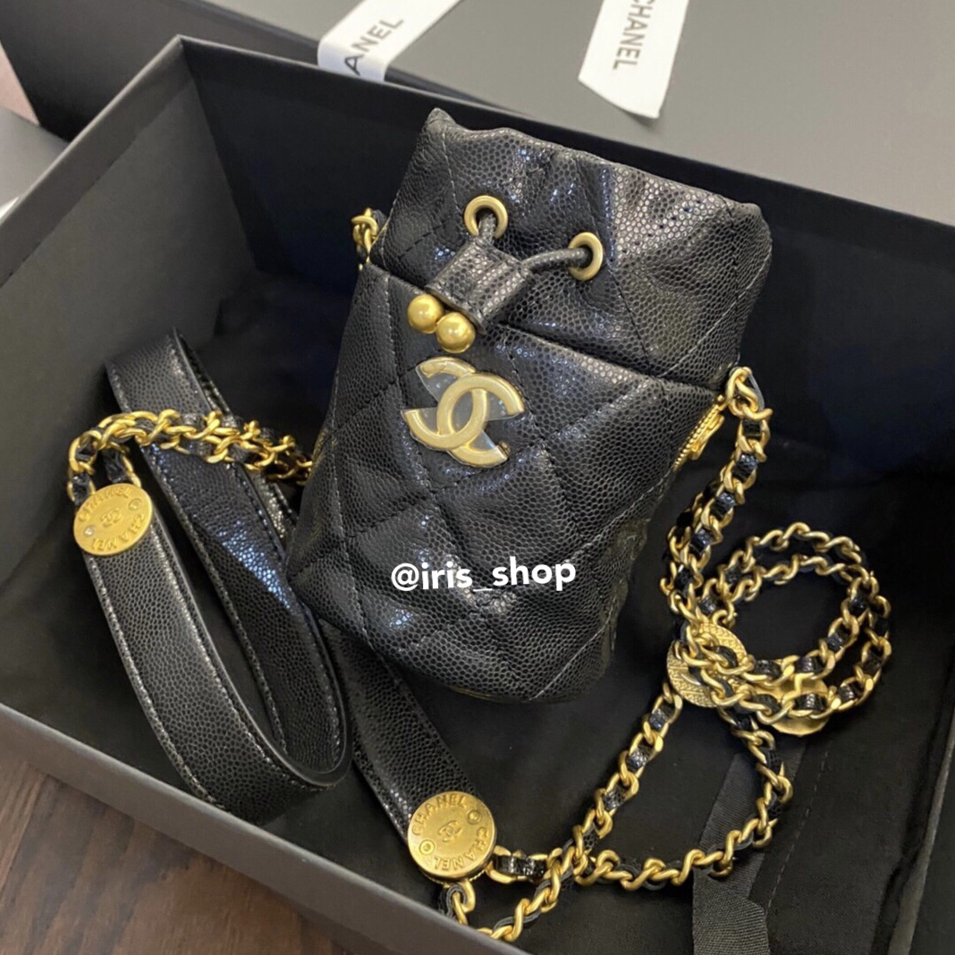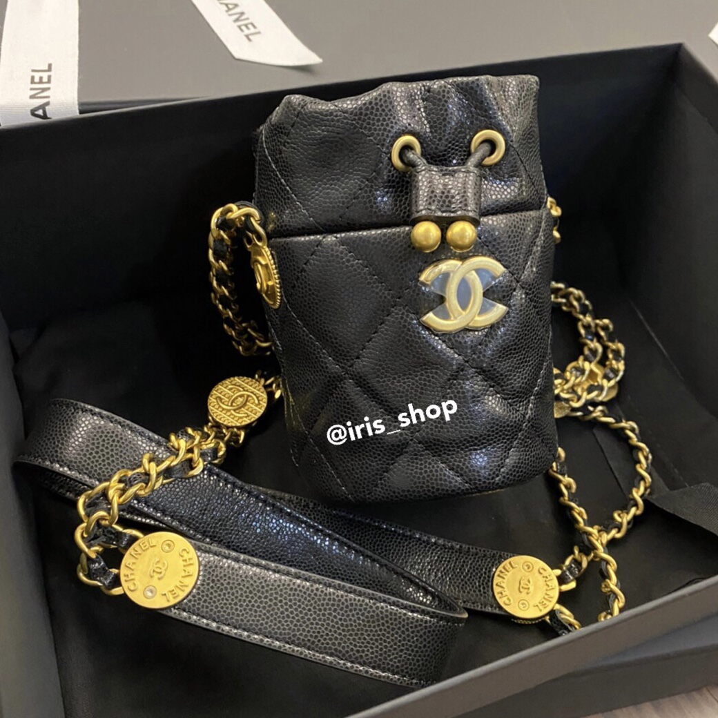 กระเป๋าทรงถังใบเล็กสุดน่ารักขนาด 11 × 9 × 8.8 cm หนังคาเวียสีดำ อะไหล่ทอง สายสะพายแต่งด้วยเหรียญโลโก้ CC สีทอง สะพายแล้วน่ารักสุดๆ