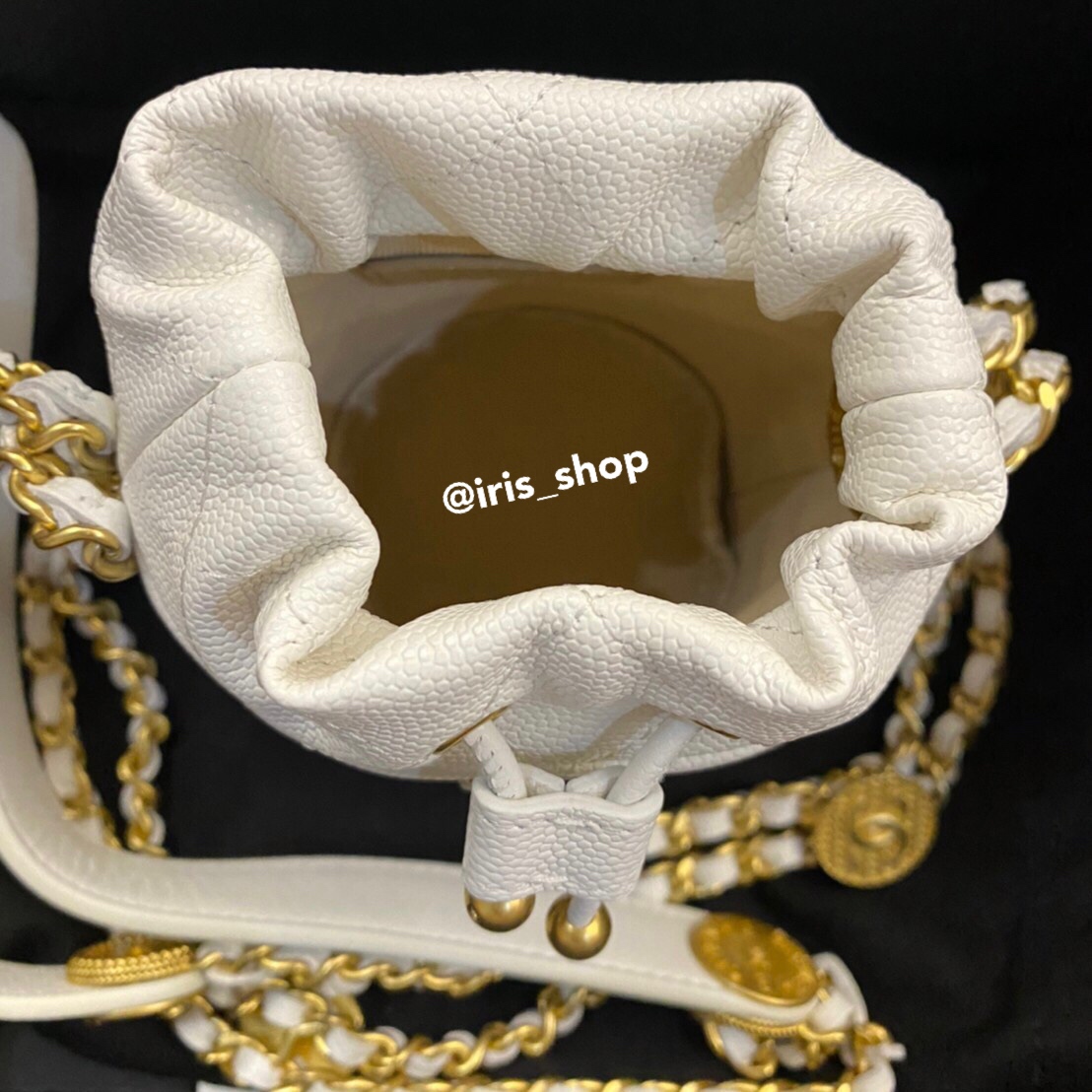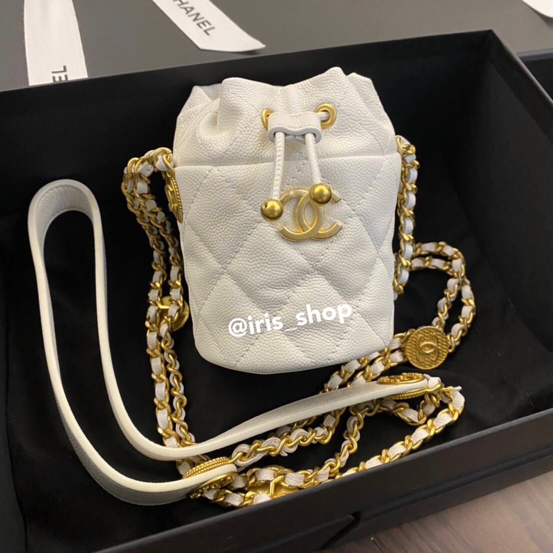 กระเป๋าทรงถังใบเล็กสุดน่ารักขนาด 11 × 9 × 8.8 cm หนังคาเวียสีขาว อะไหล่ทอง สายสะพายแต่งด้วยเหรียญโลโก้ CC สีทอง สะพายแล้วน่ารักสุดๆ
