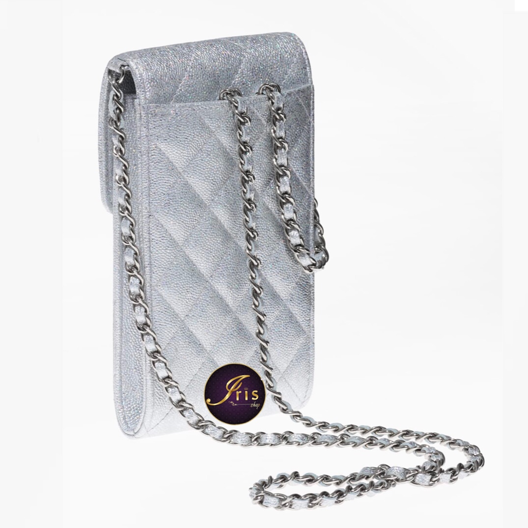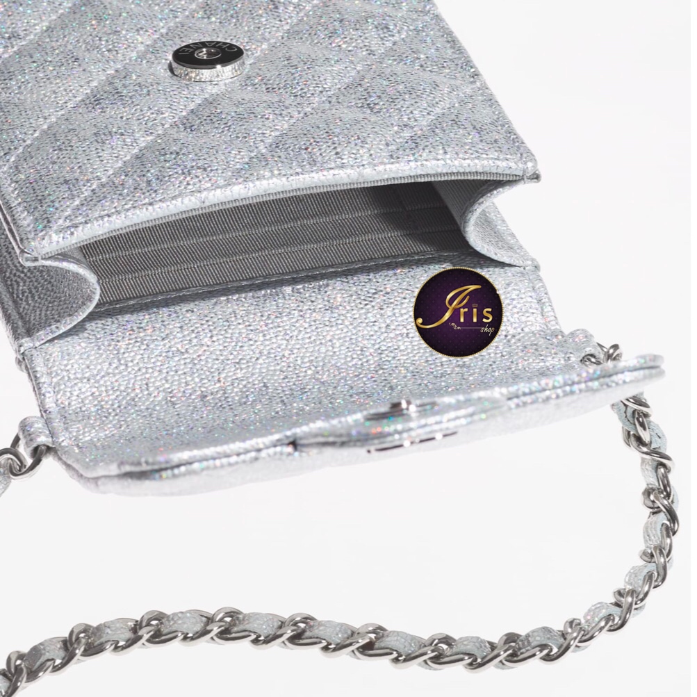 กระเป๋า Chanel phone holder bag silver glittered metallic คอลเลคชั่น fall-winter 2021 สีสวย น่ารักมากเลยค่ะ