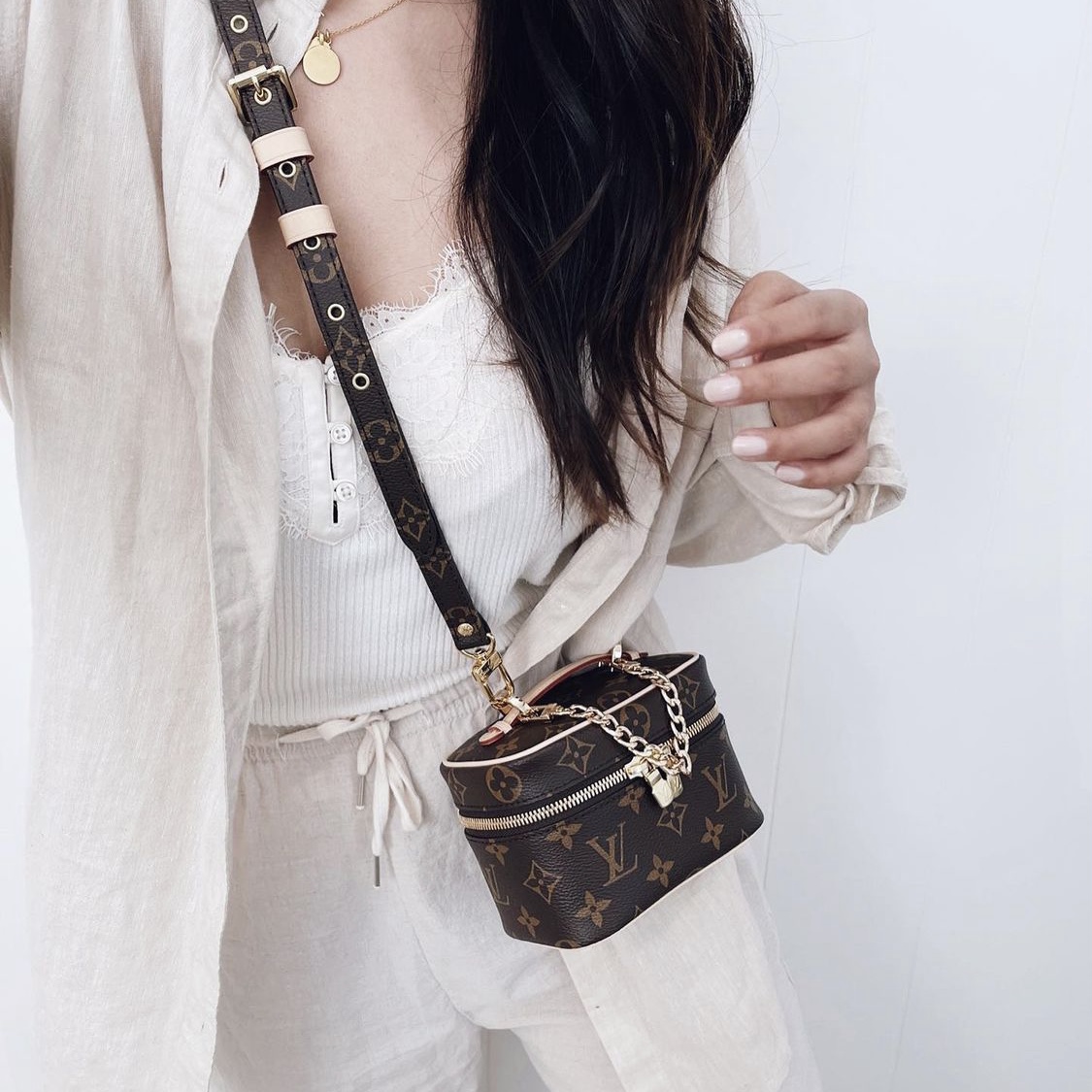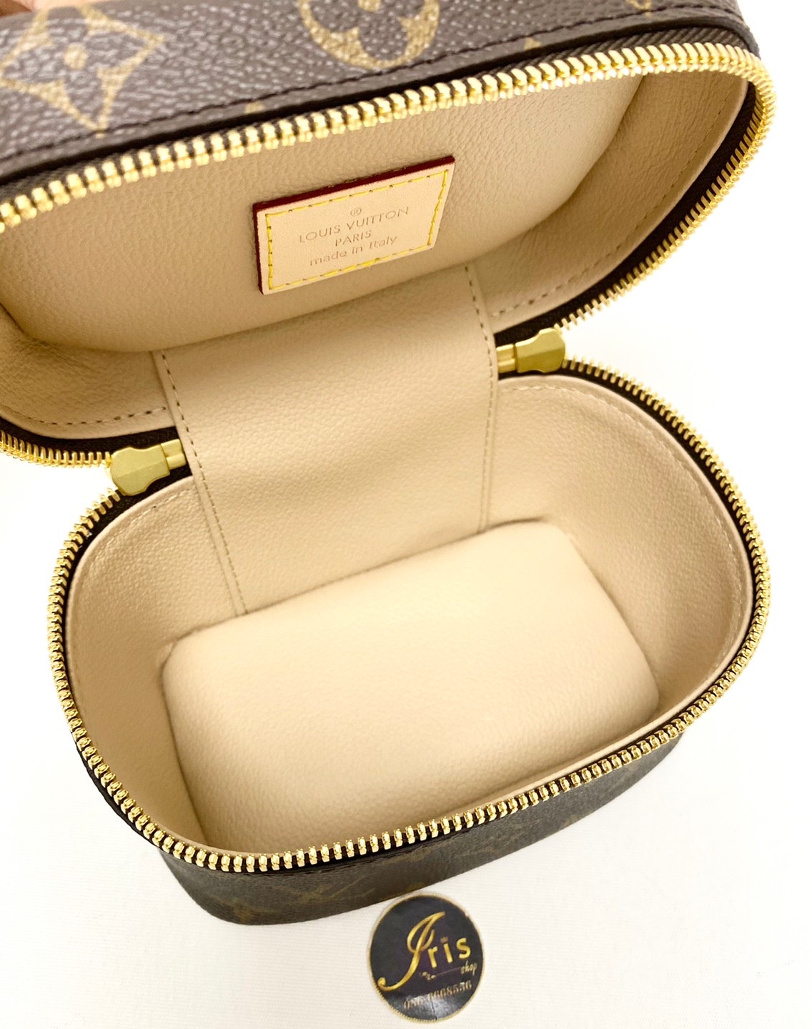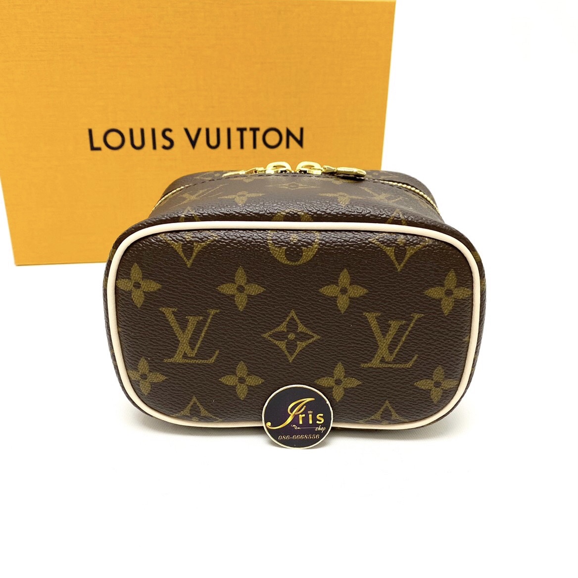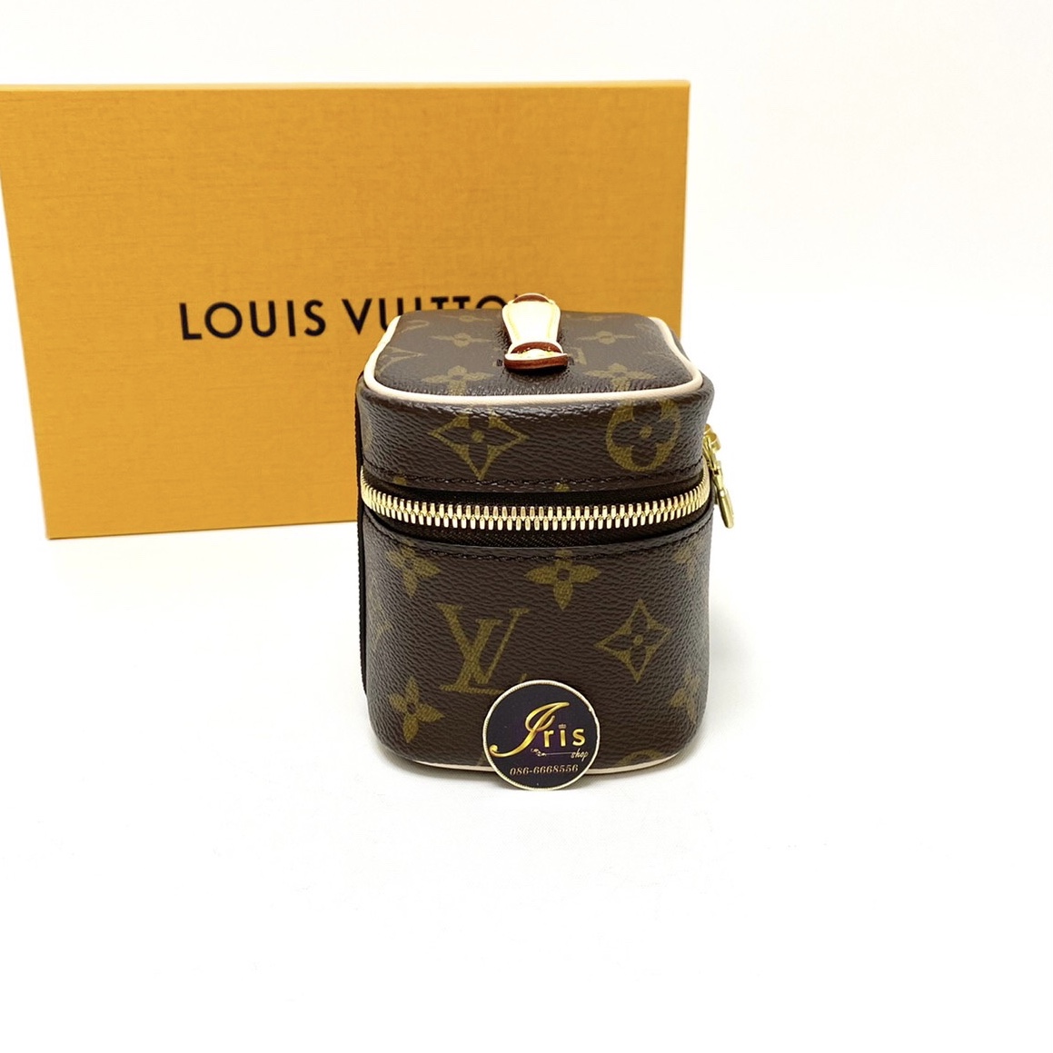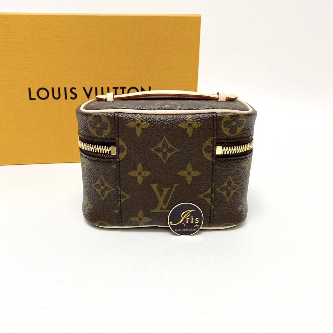 กระเป๋าทรงเหลี่ยมสำหรับใส่เครื่องสำอางกลายมาเป็นไอเท็มยอดฮิตด้วยดีไซส์หรูหรา ไซส์ nano ขนาด 14 x 10.2 x 8.5 cm อะไหล่ซิปสีทองคู่เปิด-ปิดง่าย หูจับ cowhide หนังลาย monogram เราสามารถหาสายสะพายเก๋ๆ มาคล้องใช้เป็นกระเป๋าสะพายได้นะคะ