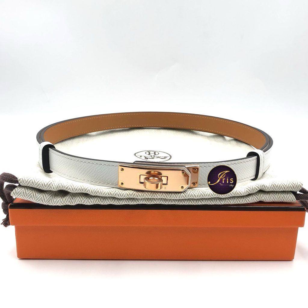 เข็มขัด Kelly belt ขนาด 18 mm หนัง epsom สีขาว หัวเข็มขัด Kelly อะไหล่สี rose gold ตัวเข็มขัดปรับได้ตั้งแต่ 50 -100 cm สวยเรียบหรูมาก ใส่กับเดรส กางเกง หรือแม้แต่ยีนส์ก็หยิบมาแมตซ์ใส่ด้วยกันได้ค่ะ